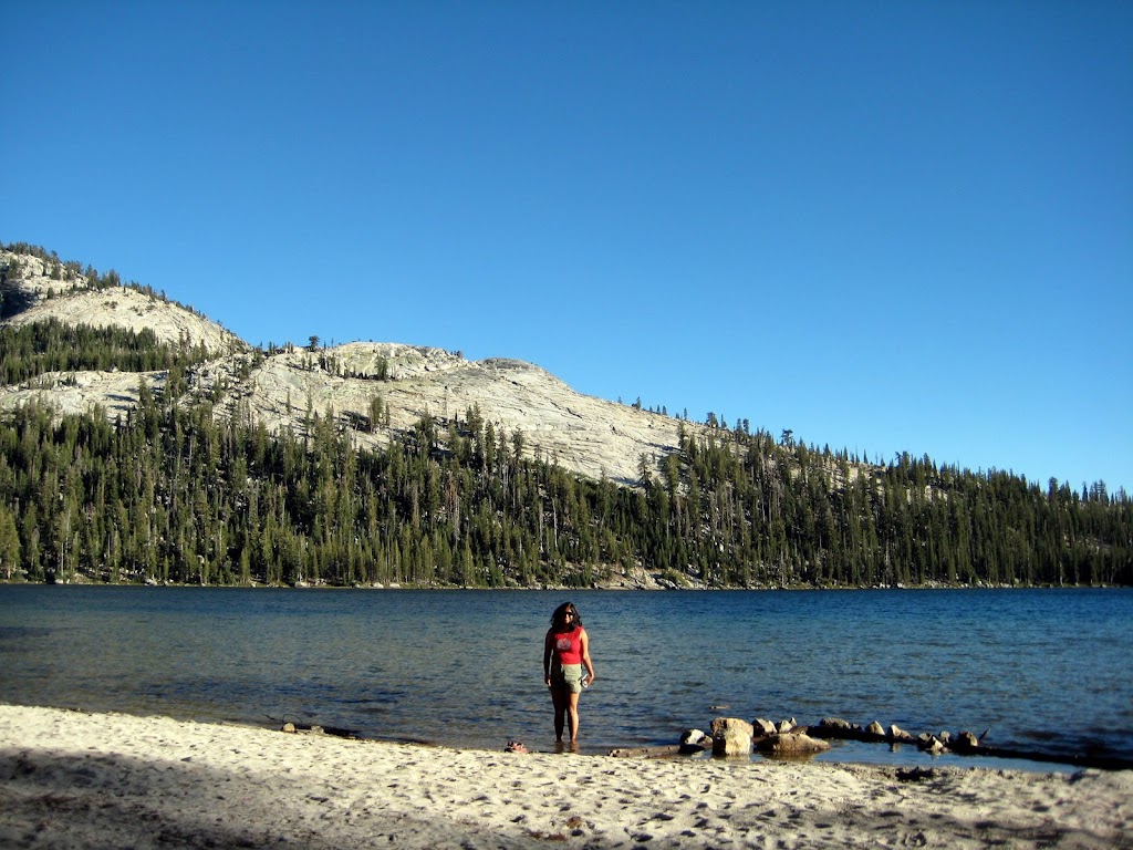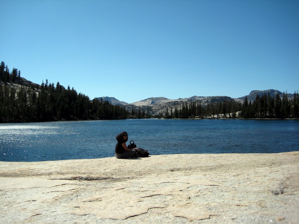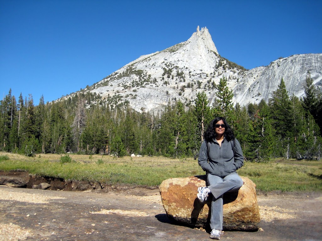 We started for Tuolumne Meadows Saturday afternoon. Srikant, Sridevi and Sriram were already there from Friday night. We stopped at "Dhaba Indian Cuisine" in Tracy for lunch. It was a pretty decent place. The drive to Yosemite was good - we did not encounter much traffic. Stopped at Tenaya Lake on our way to soak up to the Sun ;-)