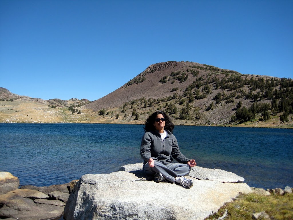 After we caught sight of the pristine blue water of Gaylor lake, we had to climb downhill for a while. We walked around the lake stopping at several spots to take photos. It was a perfect place to meditate - there was absolutely nobody. You just become one with nature. We did not meditate but we took some pics in which we posed like we were meditating.